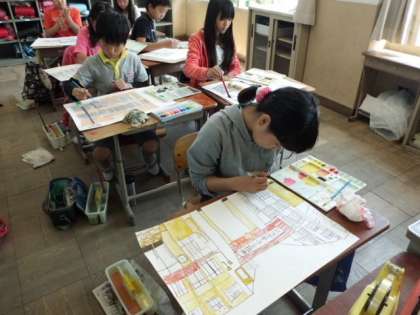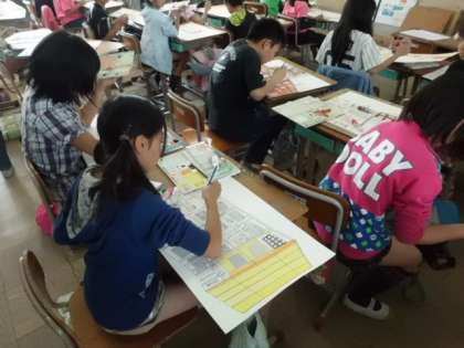 学校内の好きな風景を写生してきましたが,いよいよ着色です。細かな部分までとても繊細に作業しています。集中力MAXでした。