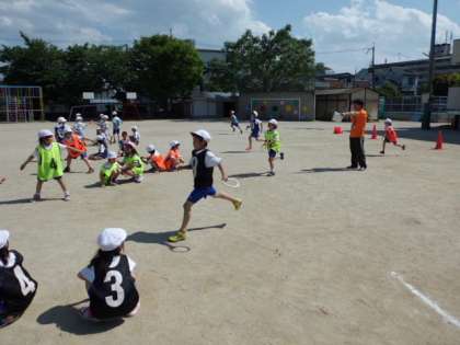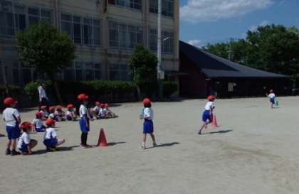 とても気持ちよいお天気のもと,2年生がリレーの学習に取り組んでいました。みんなで「がんばれ〜」と声をかけあって必死で応援しながらがんばっていました。走りもよく,バトンパスもなかなかうまくできていました。