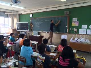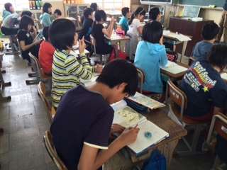 歴史学習にみんなたいへん興味をもち,意欲的に学習しています。担任の先生が,天皇家と蘇我一族の争いを得意の?イラストつきで解説し,みんな真剣にメモを取っていました。