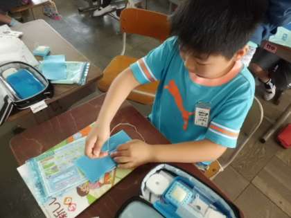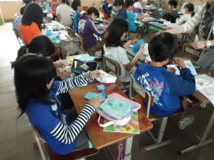 いよいよ家庭科でさいほうセットを使い始めました。慣れない手つきですが,細い糸を小さな針穴に通して奮闘しています。まずは,玉結びと玉どめです。特に玉どめが難しくて,布から少しういたところに玉が・・・それはひじょうにまずいので,作品を作るまでには,しっかり布にフィットした玉どめができるようにがんばりましょうね。