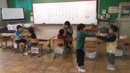 音楽のリズム遊びで,『まじょのタンゴ』『かもつ列車』『なべなべそこぬけ』を学習しました。子どもたちは,リズムに合わせて楽しんで体を動かしていました。