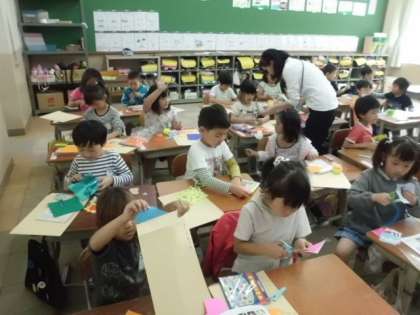 色紙やきれいな紙で教室を飾り付けするようです。みんなとてもきれいな模様に紙を切って誇らしげに見せてくれました。教室がきれいに飾りつけられるのがすごく楽しみですね。