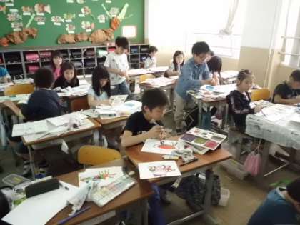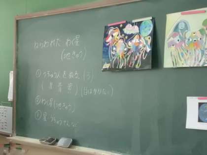不気味な宇宙人に「ねらわれたわく星」という設定で作品作りに取り組んでいます。宇宙人は自分でいろいろな色を作りカラフルな仕上げとなっていました。わく星や宇宙船もきれいにぬっていました。