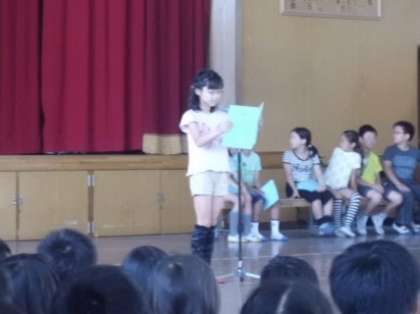 芝生のグランドで思いきり遊んだことも楽しい思い出として発表してくれました。磯観察では珍しい生き物をたくさん発見したこと。鳥羽水族館では,いろいろな魚を見たり,ショーを見たりして楽しかったことも発表してくれました。