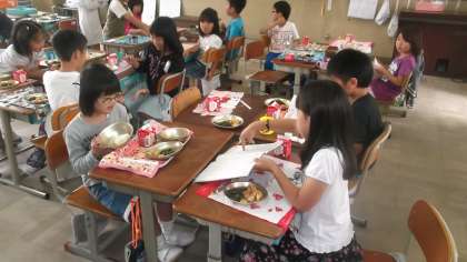 なかよし学級の2年生のお友達と2年生が今週から給食交流をしています。1組から順番にまわっています。今日は2組へいきました。机を向かい合せにして,楽しくおしゃべりをしながら給食をいただきました。お昼休みに遊ぶ約束をして,仲良く遊びました。少しずつ交流が深まっているようですね。