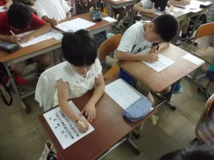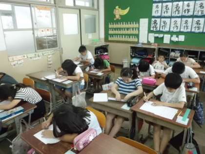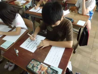 今日は清書をしました。4年生はフェルトペンで書かなくてはいけないので,消して書き直すことができません。みんなの緊張感も集中力もMAXです。
