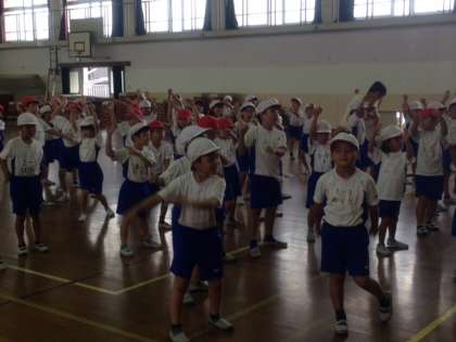 2年生,全員が体育館に集まってダンスの練習。今日は一つずつの振りを覚えるところからスタート。完成すれば秋の運動会で発表されるかもしれません。どうぞお楽しみに!