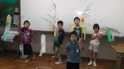 七夕かざりを作りました。子どもたちはそれぞれに願いごとを短冊に書き,笹かざりを作ってかざりました。子どもたちの願いがかないますように・・・。