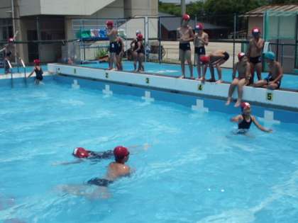 時おり小雨が降る中、4年生の子どもたちは雨にも負けず、水泳検定を受けていました。