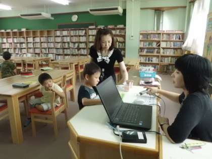 先生に本の借り方を教えてもらいながら、子どもたちは「この本を借ります。」と言って上手に借りることができました。