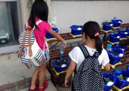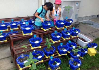 毎朝,登校したらすぐ植木鉢に向かう3年生。ひまわりや大豆など自ら選んだ植物の成長を確認しながら,水をやっています。社会見学に行く今日ももちろん水やりです。台風が近づいていても水やりです。