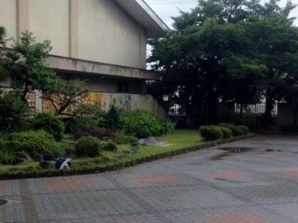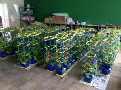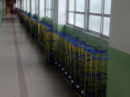台風の強風に備えて普段は正門前に置いている植木鉢を空き教室や廊下などに一時的に避難させました。