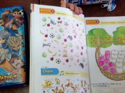 5秒間,絵を見て記憶。オレンジは何個あった?記憶クイズをしながら楽しく英語活動しています。