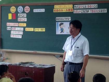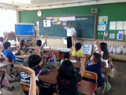 京都府警のスクールサポーターの方々にご来校いただき,3年生と5年生の各クラスで授業をしていただきました。「物事の善悪を理解して正しい行動ができるようにしよう」をテーマにいじめや万引きなどの具体的な事例から分かりやすくご指導いただきました。24日(木)からの夏休みも健康で安全に過ごしてくれることを望んでいます。サポーターの皆様,本当にありがとうございました。