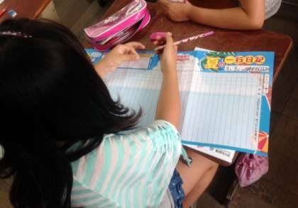 3年生の教室では夏休みの宿題が子どもたちに配られていました。早速,予定表の中に夏休みの目あてを書き込んでいました。「毎日,マラソン頑張るの?」