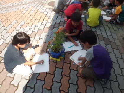 グループで育てているミニひまわりやホウセンカなどを観察しました。夏休みの間も元気に育って,とても大きくなったりきれいな花を咲かせたりしています。これからも大切に育てていきましょうね。