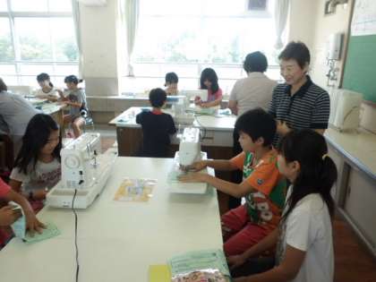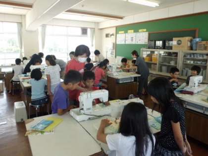 昨日,今日にかけて5年生3クラスの学習を地域の方々にご協力いただきました。ミシンの上糸のかけかた,下糸の出し方をまず教えていただきました。