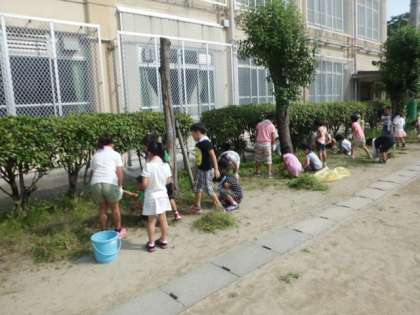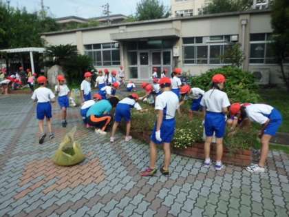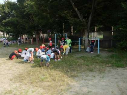 今日の1時間目は,クリーン大作戦でした。全校児童で,運動場の石拾いをしたり,夏の間にのびた雑草を抜いたりしました。