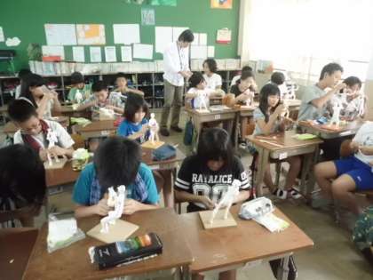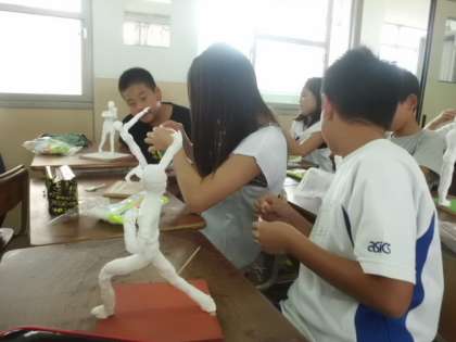 針がねと紙ねんどで人の動きを表現しています。針がねを骨格や関節に,紙ねんどを筋肉に・・・自分でポーズをとったり,友達にポーズをとってもらったりしながら,迫力のある動きが表現できていました。
