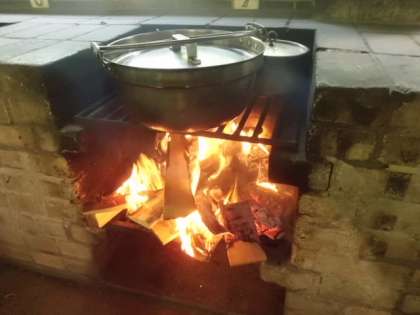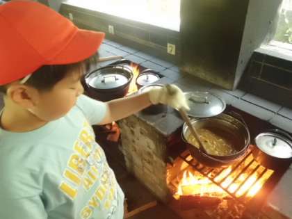 かまどの火力を微妙に調節しながら,ごはんとカレーを仕上げていきます。カレールウがこげつかないように,かきまぜながら・・・