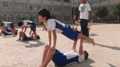 交流体育で組み体操をしました。立ち方や姿勢など基本動作を確認した後,二人技・三人技に挑戦しました。暑い中でしたが,友達と声をかけ合いながら頑張りました。