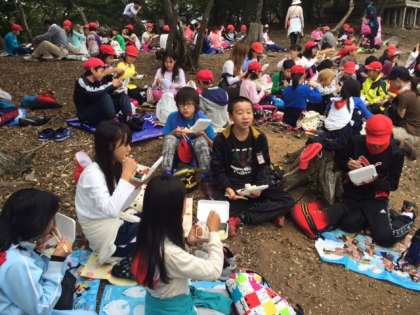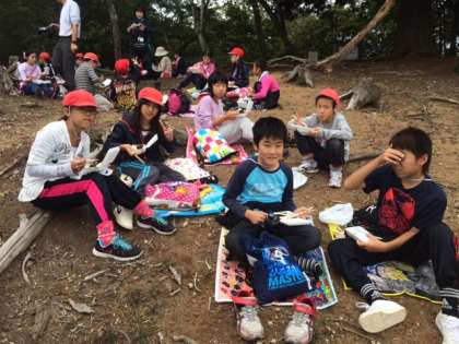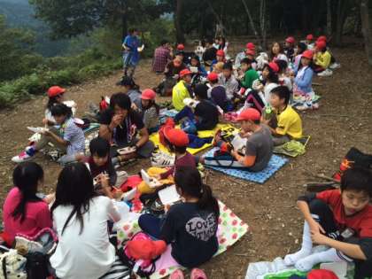 みんなで力を合わせて登りきって頂上付近でお昼ごはんを食べました。