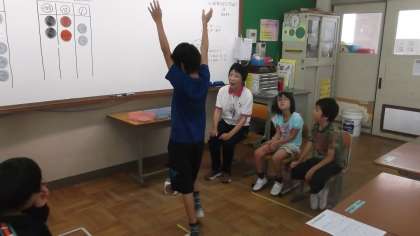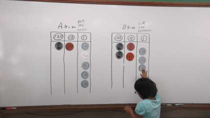 算数の時間にお金ゲームをしました。2チームに分かれ,100円玉・10円玉・1円玉,3種類の金種でさいころをころがしていきました。3周回ったところで,高学年児童が各チームのお金の合計を計算して,どちらが多いかを発表しました。低学年児童は,金種ごとに枚数を数えたり,『○円です。』と発表するなど,それぞれのめあてをもって活動しました。