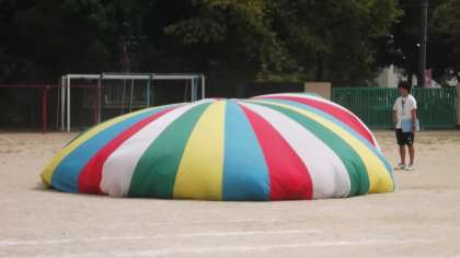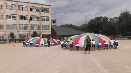 3校時に3年生とバルーンをしました。今日は,初めて運動場で演技をしました。今日のめあては,行進を元気よくすることと,号令なしで演技をすることでした。少し風があったので,いつもよりしっかりバルーンをもたないといけませんでしたが,なかよし学級の児童と3年生児童との心が一つになり,運動場にきれいなバルーンの花がさきました。