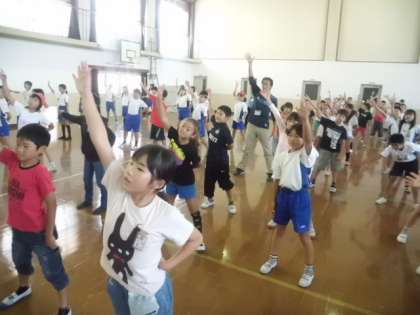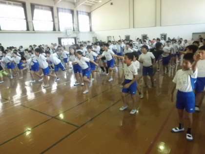 運動会の開会式の時に,準備体操としておどる,ダンスの初練習を行いました。ダンス係が前でおどるのと,担当の世良先生の指導に合わせてみんなノリノリでおどっていました。さすがに子どもたちは動きを覚えるのが早いです。