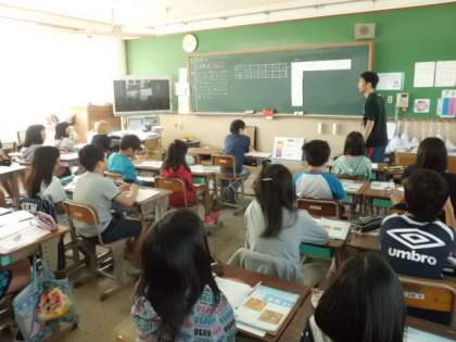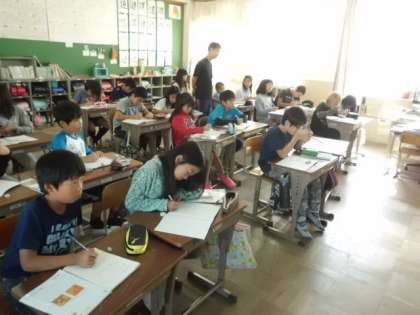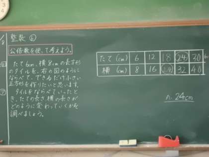 公倍数の考え方を使った応用問題に取り組んでいました。かなり難しく,いろいろな意見が出ましたが,みんなで力を出し合って見事,解を導き出していました。