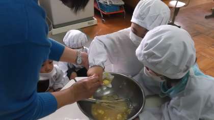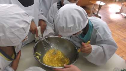 お誕生会では,お誕生ケーキも作りました。材料を混ぜる係や食器を準備する係など子どもたち一人ひとりが自分の仕事をしっかりとこなしました。おいしいケーキができるといいですね。