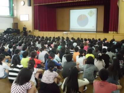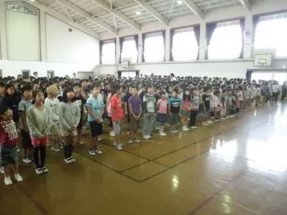今日は前期の終業式がありました。まず最初に大きな声で校歌をうたいました。校長先生のお話では,前期の学校評価をもとに,多くの人が楽しく学校生活を送れている事についてほめてもらいました。さらに後期は,しっかりあいさつをしていこう・勉強をがんばっていこうというお話がありました。