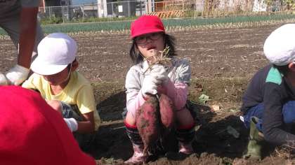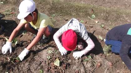 生活科の交流学習で校区の畑にお芋掘りにいきました。少しだけ掘ると,みごとなサツマイモがでてきました!子どもたちは『うわ〜!大きい。』『すごいな〜。』『顔より大きいよ。』など歓声をあげていました。たくさんのサツマイモをいただいて大喜びの子どもたちでした。お世話いただいた地域の方々ありがとうございました。