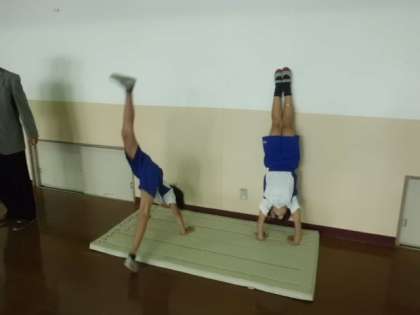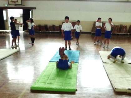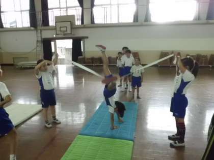 自分のできる技で連続して回ったり,新しい技に挑戦したりして一生けんめいがんばっていました。友だちと協力したり,アドバイスし合ったりしながら元気よく活動していました。