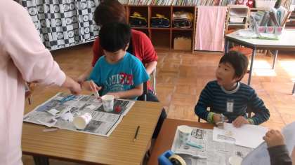 2校時に西総合支援学校のお友達と図画工作で交流学習しました。紙コップロケットを作りました。ゴムで跳ぶおもちゃです。紙コップにはさみで切込みを入れて,輪ゴムを通して作りました。出来上がったロケットをとばしてみんなで遊びました。『うわ〜。跳んだ〜。』『高く跳んだね〜。』など,歓声をあげながら活動を楽しみました。