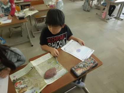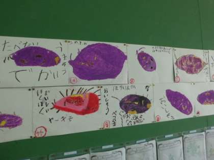 収穫したさつまいもを書きました。とても大きくておいしそうなさつまいもですね。来週の月曜日はさつまいもパーティーです。地域の方にもたくさんお世話になります。すごく楽しみですね。