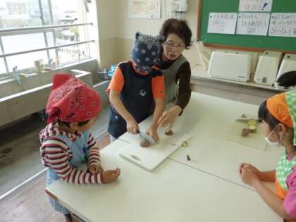 みんな素晴らしい?包丁さばきでほどよい大きさに切り,鍋でクツクツと・・・待つこと数分間,おいしそうな「おいも」がゆで上がりました。
