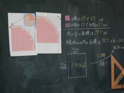 円の面積を方眼を用いて求めていました。4分の1の円では,方眼○個分だから,×4して・・・何とか面積らしきものは求められましたが,もっといい方法はないものでしょうか???