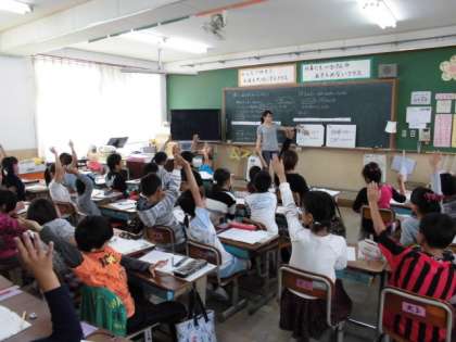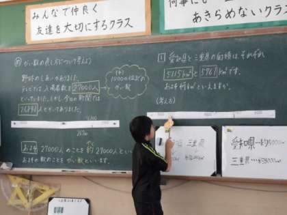 約何千・約何万などがい数で表わすと便利な時がありますね。今日はその学習をしていました。がい数で表わす時に切り上げるのか,切り捨てるのかどう判断するかをみんなで話し合っていました。