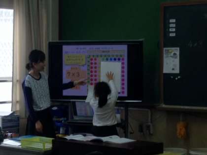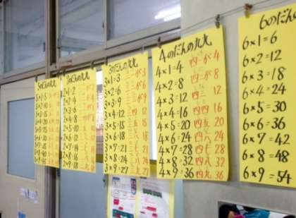 かけ算「九九」の学習に活動を取り入れ大型テレビも用いて分かりやすく学習しています。また教室内の掲示物を使って覚えやすくしています。