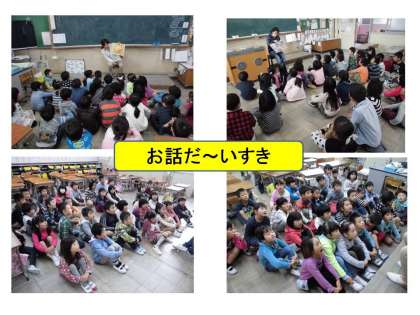今日のさわやかモーニング,1組は一ノ瀬先生に『14ひきのさむいふゆ』,2組は世良先生に『きょうりゅうたちのおやすみなさい』を読んでもらいました。とても楽しいお話に子どもたちは大喜びでした。