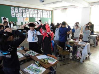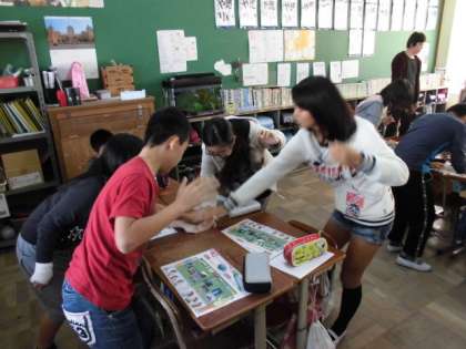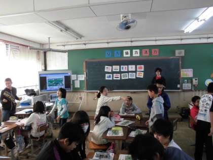 国旗を見て国名を答えたり,国旗クイズをしたりしていました。国名消しゴム取り競争では,班で激しいバトルが繰り広げられました。いつもながら楽しく盛り上がっていた英語活動でした。