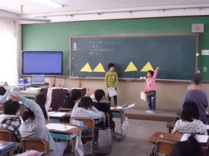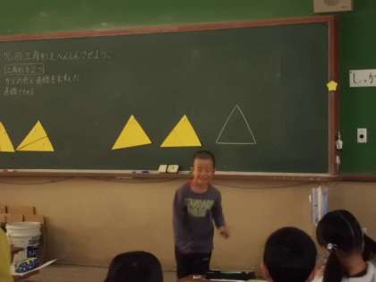 三角形を直線で2つに切って,ちがう形を生み出していました。切るところによって色々な形ができて,楽しく活動できました。