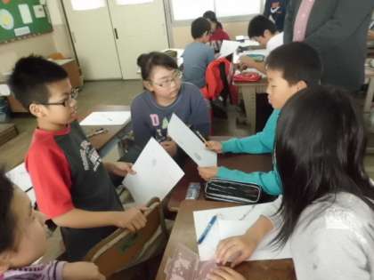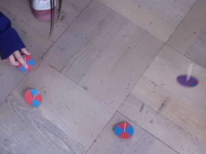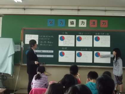 6年生が1年生にプレゼントすべく作ったコマ・・・。赤い部分と青い部分の割合を説明するためにはどのように説明したらいいのか?みんなこれまでの既習事項を活用して,いろいろな説明方法を考え,交流していました。