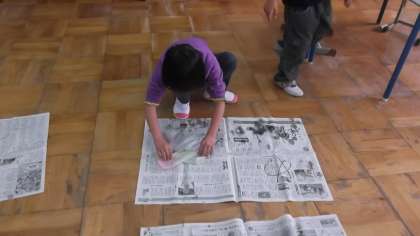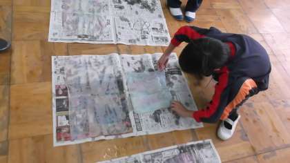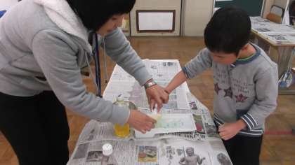 図工の時間におりぞめをしました。和紙をくしゃくしゃにまるめてから,好きな色に染めました。どんな色に染まっているのか楽しみです。