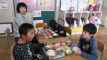 今日も4年1組のお友達が交流給食にきてくれました。会話の中心は,やはり学芸会でした。「学芸会は何するの?」「何の役?」などお互いに質問し合っていました。