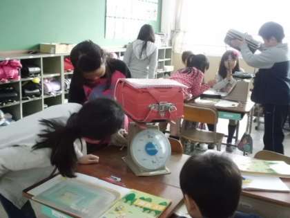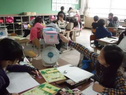身のまわりのいろいろな物の重さをはかりを使って量っていました。1メモリが何グラムを表わしているのかを考え,メモリを真正面から読み取りましょうね。