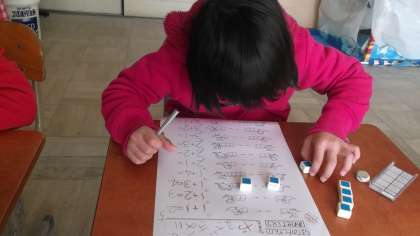 毎日,数図ブロックや数字カードをつかって算数の学習をしています。1問ずつ,ゆっくり丁寧に問きます。できたら先生にはなまるをもらいます。