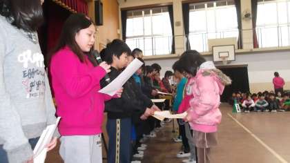 先月の給食週間に残菜がゼロの日が5日間続いたので,給食委員会より賞状をいただきました。これからも栄養たっぷりの給食を食べて,元気に寒い冬を乗り切りたいです。
