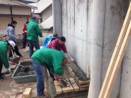 いよいよ煉瓦をつんで本格的にかまど作りが始まりました。休日にもかかわらず多くの地域の方,PTAの方に参加していただき,一日かけておよそ半分程度出来ました。ご協力いただき本当にありがとうございます。